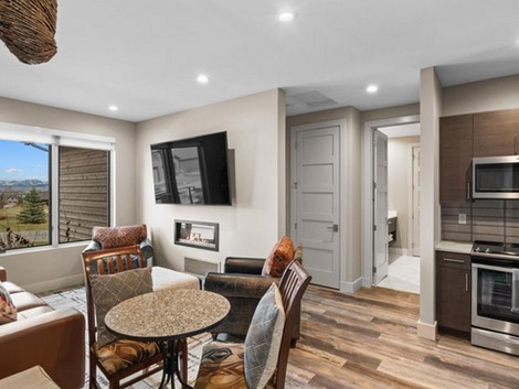 This Cottage features a spacious bedroom with room for an additional office area or workout space. The bathroom boasts a spa-like atmosphere with dual sinks, a walk-in shower, and under-cabinet and mirror lighting. The living area and kitchen are equipped with stainless steel appliances and a fireplace. A new washer and dryer are also included in the unit.